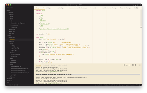 colours. But after another ten minutes or hour, I’d spot another problem. And another, and another. And each time, I ended up picking just some colour that worked out of Prism, meaning I was getting further and further from Monokai Pro. While at some point I realised it’d be smarter to diff against the original sidebar colours, I’d decided by this point that the dark sidebar wasn’t working well for me against the lighter editor theme. Something was off about the tabs as well.