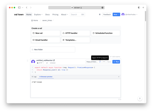 Val Town calls these runnable snippets “vals”. Here’s the boilerplate HTTP handler val: