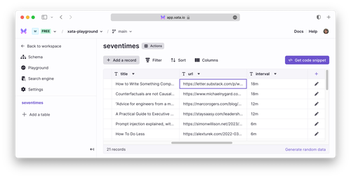 All in all, it took about five minutes to create the original schema and another five minutes of edits over time to get to the final schema. I also spent about twenty minutes exporting and munging my Omnifocus “re-read” tasks so I could import them into Xata via CSV.