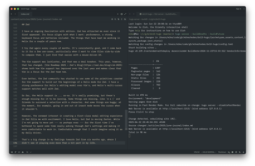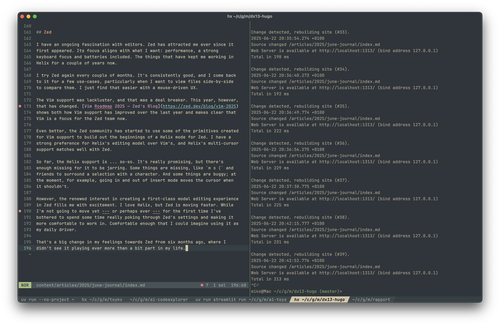 So I keep coming back to Zed, again and again. I try it every couple of months. It’s consistently good, and I do come back to it regularly for a few use-cases, particularly when I want to view files side-by-side to compare them. I just find that easier with a mouse-driven UX.