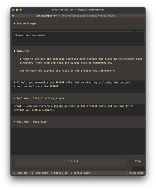 It’s not yet merged as it has a lot of rough edges — I’m only really just starting to get to grips with textual’s event model and ways to break code apart into self-contained units. In the UI itself, the tool call foldables also don’t feel very well spaced against the model commentry around them. The chatbox at the bottom also only displays input on a single line, that needs fixing. The Stop button doesn’t work most of the time. So, yes, quite broken really!