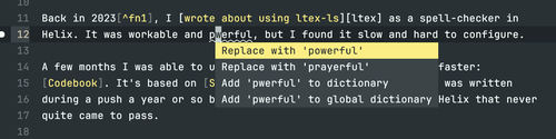 Back in 20231, I wrote about using ltex-ls as a spell-checker in Helix. It was workable and powerful, but I found it slow and hard to configure.