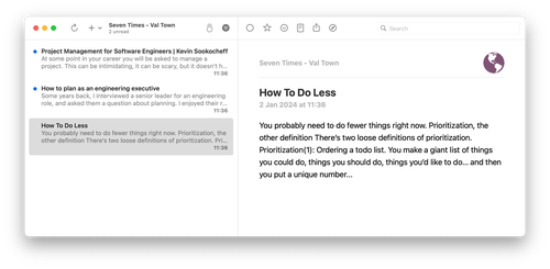 But what would be my “usual process”? What user experience should Seven Times have? I am a heavy consumer of RSS feeds (using NetNewsWire and FeedBin). It took a while for me to connect the two, but once I’d had the idea of making Seven Times an RSS feed, I couldn’t shake it.
