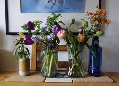 Now spring has arrived, we’re starting the year’s harvest the from the cut flower bed. That makes it sound like we live in a stately home with a huge garden. We most certainly don’t. We have set aside a small raised bed, around 1m x 2m, for this, and it turns out that you can pack quite a lot into it, if you plan.